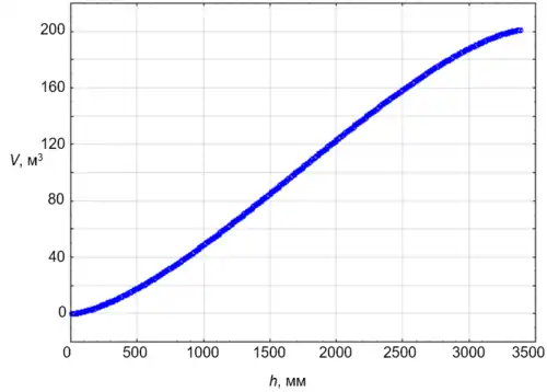 - обмірюванням і розрахунком об'єму резервуара, виходячи з його фактичних розмірів — цей спосіб складання градуювальних таблиць є найбільш поширеним, тому що є більш швидким та порівняно дешевим та має практично таку ж точність як і проливні методи - див. наприклад [2] (проте, важливо відмітити, що у процесі наливу резервуар змінює свою геометрію і в цьому випадку методи проливу дають біль точні результати калібрування).