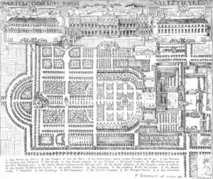 Гравер Тобіас Кверфурт 1710 року опрлюднив гравюри його роботи з краєвидами і спорудами резиденції. Ансамбль з двох боків оточували рови, з третього вибудували стіну. На вході вибудували вартівню.