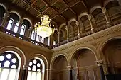 Зала була заввишки 20 м, на 2 метра вище сучасної. Стеля — мальовнича, дубова, різьблена з куполами, й багатою орнаментикою, звідки звисали кришталеві срібні люстри.