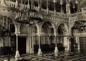 Мармурова зала (Синодальна зала), виконана з білого та чорного мармуру, завжди вражала своєю величчю. Особливістю інтер'єру є наявність бічних колонади та аркади, за допомогою яких сформована дворівнева галерея.