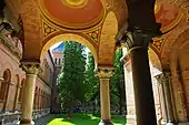 У тимпанах одинадцятьох арок та в простінках між колонами, оздоблених буковинським алебастром, австрійським маляромпрофесором Карлом Йобстом були нанесені мальовничі фрески на релігійну та історичну тематику. Зокрема, «Навернення у віру рівноапостольного імператора Костянтина», «Святкування дня присяги Буковини 1777 р.», «Перенесення мощів Святого Івана з Трапезунда до Сучави на початку XV ст.», «Заснування Релігійного фонду 1786 р.» тощо.