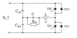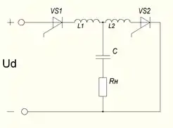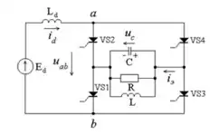 4 робочих тиристори, зібраних за однофазною мостовою схемою, в діагональ змінного струму вмикається коло навантаження, комутаційна індуктивність виноситься в коло постійного струму. Параметри опору навантаження, а також комутуючі елементи вибираються з умови забезпечення коливального характеру зміни струму навантаження. Максимальна напруга на конденсаторі при перезаряді, має бути більше за напругу джерела постійної напруги.