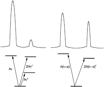 Ідеалізована поява нормального режиму і обертон до і після резонансу Фермі. Під ідеалізованими спектрами ідеалізовані схеми рівнів енергії.