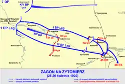 25 квітня, о 3.00, був завантажений 1-й Легіонський піхотний полк в автомобілі. Через нестачу транспорту третій батальйон полку мав добиратися пішки. На автомобілях було розміщено ще 25 км від 5-го піхотного полку. З колоною їхав командувач 1-ї піхотної бригади легіону - полковник Стефан Даб-Бернацький. Ok 3,30 підрозділів 6 PPLeg з 3 BPLeg розбили оборону противника на Murawnia в сутичках з радянською кавалерією, вони переїхали в Житомир. 1049/5000 5 р. Лег розгромив поспішну радянську кавалерію над Тенні. Під час маршруту автомобілі застрягли на піщаних дорогах, грілися, а броньовані автомобілі розбивали мости. Місцеве населення зібралося на колонних маршрутах, вітало солдатів молоком і водою і підтримувало підводні човни. Близько 12.30 група перебувала в 14 км на північний захід від Житомира під селищем Вільськ, захищеним стрілецьким полком 522. Полк вийшов, не прийнявши бій. Полковник Даб-Бернацький зупинив колону у Вільско, щоб дочекатися решти машин і організувати 1 ряди БПлег перед очікуваним боєм. Після прибуття автомобілів, піхота була вивантажена з них і відправлена в розпорядження 3 BPLeg, яка просувалася по дорозі. Між 22.00 і 23.00 прибули в Вільську, 3-го батальйону 5 п.п.Лег, під час 3-го батальйону 1 п.п. Вона застрягла моторизовану батарею по дорозі і не було ніякої надії приєднатися до неї. Протягом дня 522 П. напали на польських військ у Вілську, проте він був відбитий і відступив до Житомира. Наприкінці вечора полковник Даб-Бернацький мав три батальйони і бронеавтомобіль у Вілсоку. Полковник Даб-Бєрнацький, побоюючись втратити здивування, наказав негайно напасти на Житомир двома колонами. О 24.00 два батальйони по 1 л.п. Третій батальйон 5 п.п.Лег, підкріплений компанією ckm з 1 п.п.Легом і броньовиком, пройшов по дорозі на Житомир. Третій батальйон досягла краю Житомира на світанку. Росіяни отримали поляків з сильним вогнем. Поляки пішли позаду і не чіпали, чекаючи 1 п.л. сил. 1 ppLeg боровся на шляху боротьби з пік 520 далі, підтримував 522 плями, і 26 квітня близько 8.00 він стояв зі сходу на краю Житомира. I батальйон 1 п.Лег вдарив дві компанії відразу на залізничну станцію в Житомирі і після відштовхування кавалерійської атаки захопив станцію. Сюрприз був повний. Екіпаж станції втік у бік міста, а потім дві польські компанії. 3-я рота 1-го батальйону взяла на себе радянську батарею. Полковник Даб-Бернацкий на звуці стрільби напав на третій батальйон 5-ти ppLeg на атаку. Після короткого опору екіпаж міста, якого загрожував коліна, вийшов. До 11.00 Житомир перебрали поляки. Вдень 6 ppLeg прибув до міста, воюючи на шляху з поділом 17-ї кавалерійської дивізії. Дві компанії 6 ППЛег були відправлені на машинах і освоїли міст на Тетерово і утворили плацдарм.