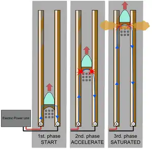 Шум. На відміну від гармати Гауса, в якій снаряд не торкається котушок, а тому безшумний (поки не досягне швидкості звуку), рейкотрон створює шум, оскільки снаряд перебуває в тісному контакті з рейками.