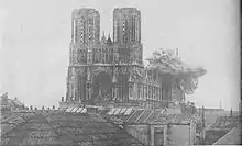 19-го вересня 1914-го двадцять п'ять снарядів влучили безпосередньо в собор[8]. Риштування, що знаходилося під північною вежею, зайнялося близько п'ятнадцятої години, після чого вогонь розповсюдився по всьому остову даху. Свинець покрівлі розплавився і, стікаючи по горгульях, зруйнував архієпіскопське помешкання — палац То. Зруйнування монументу викликало емоційну хвилю по всій країні. Багато з-поміж поранених німецьких полонених, що знайшли притулок в соборі, загинули[8].