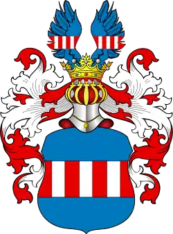 У синьому полі срібна балка, розтята трьома червоними стовпами. Намет червоний підбитий сріблом. У клейноді сині крила, перетяті срібною балкою із червоними стовпами[2].