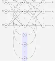 Наступний окремий випадок наведеної вище основної архітектури було застосовано Джеффом Елманом. Використовується тришарова мережа (впорядкована на ілюстрації по горизонталі як x, y та z) з додаванням набору «контекстних вузлів» (англ. context units, на ілюстрації — u). Існують з'єднання з середнього (прихованого) шару з цими контекстними вузлами з незмінними одиничними вагами.[9] На кожному такті вхід поширюється стандартним прямим чином, а потім застосовується правило навчання. Незмінні зворотні з'єднання призводять до того, що контекстні вузли завжди зберігають копію попередніх значень прихованих вузлів (оскільки вони поширюються з'єднаннями до застосування правила навчання). Таким чином, мережа Елмана може зберігати свого роду стан, що дозволяє їй виконувати такі задачі, як передбачення послідовностей, що є за межами можливостей стандартного багатошарового перцептрону.