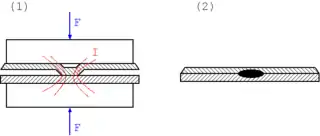 Паралельно з виникненням та збільшенням зони розплавлення навколо неї з'являється ущільнювальний пас, який має таке ж значення, як і при точковому зварюванні. Тривалість протікання зварювального струму залежить від величини рельєфу та товщини деталей. Зусилля на електродах зумовлюється міцнішими характеристиками зварюваних металів та кількістю рельєфів.