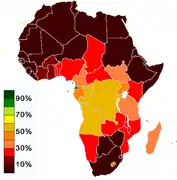 Кількість католиків на африканському континенті зросла з 2 млн 1900 року до 140 млн вірян 2000 року[26]. 1976 року на континенті до католицької церкви відносило себе 47 млн осіб (11 % населення Африки). Найбільше католиків проживало в Центральній (34 % від загальної кількості), Східній (28 %) та Західній Африці (17,5 %)[27]. Католицькі громади присутні в усіх країнах Африки, найбільші — в Нігерії, ДР Конго, Уганді, Танзанії, Анголі, Кенії. Найбільша частка католиків серед віруючих (більше 75 %) спостерігається переважно в колишніх португальських і французьких колоніях — в Кабо-Верде, Екваторіальній Гвінеї, островах Індійського океану, Сан-Томе і Принсіпі, Габоні. 2005 року католицька церква в Африці, разом з вірянами уніатських церков, нараховувала 135 млн вірян (17 % від загальної кількості віруючих). Прогнозується, що до 2025 року їхня кількість сягне 230 млн і африканські католики будуть становити 1/6 від усіх католиків світу[28][25].
