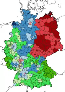 Німеччина була обернена в християнство за часів франків. Хрестителем Німеччини вважається святий Боніфацій, який був єпископом Майнца та обернув в християнство значну частину сучасної Німеччини (зазнав мученицької смерті від язичників в 754 році). На початку XVI століття в Німеччині та Швейцарії розпочалася реформація церкви, в основі якої лежали вчення Ульріха Цвінглі (Ulrich Zwingli) і Мартіна Лютера (Martin Luther). В результаті реформації та релігійних воєн, які супроводжували її (головною з яких була Тридцятилітня війна 1618-1648 рр.), Німеччина розділилася на католицькі й протестантські (лютеранські) регіони. Головним принципом, закріпленому в Вестфальському мирному договорі 1648 р. став принцип cujus regio, ejus religio, тобто піддані того чи іншого феодала були зобов'язані приймати його віру: католицьку або протестантську.