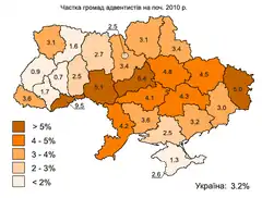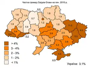 Частка громад Свідків Єгови по регіонах на 01.01.2010)