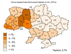 Географічне поширення релігії в Україні неоднорідне. 34,5 відсотка (або 11642 громад) релігійних громад розташовано у західному регіоні України, 23 відсотки (або 7762 громад) розташовані у центральному регіоні, 17,3 відсотка (або 5853 громад) розташовано у південному регіоні та лише 9,3 відсотка (або 3138 громад) розташовано у східному регіоні[13].
