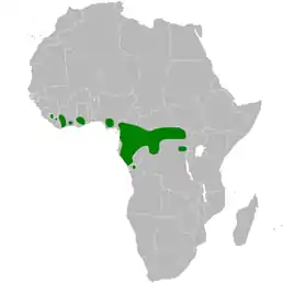 Вид поширений в Західній і Центральній Африці. Він трапляється в Камеруні, Центральноафриканській Республіці, Республіці Конго, Демократичній Республіці Конго, Кот-д'Івуарі, Габоні, Гані, Ліберії та Нігерії.