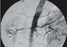 - Ренгеноконтрасна ангіографія — «золотий стандарт» в діагностиці стенозу ниркових артерій. Ангіографічне обстеження можна проводити, обминаючи скрінінгові процедури (радіоізотопні, ультразвукові), якщо імовірність звуження ниркової артерії висока (слід брати до уваги ризик, що виникає внаслідок інвазивних методів — нефротоксична дія контрастної речовини, можливість емболізації холестериновими масами чи ураження стінки судини);