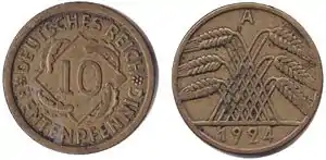 10 рентенпфеннігів | 21 | 4 | 90 зарубок | 91,5 % міді, 8,5 % алюмінію | 1923—1925 | 1923-1924 (A) — 169956017, 1923-1924 (D) — 33893698, 1923-1924 (F) — 42237299, 1923-1924 (G) — 18758277, 1924 (E) — 18679000, 1924 (J) — 33928168, 1925 (F) — 12500 | |