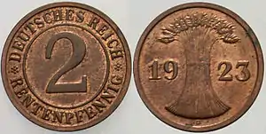 1 рентенпфенніг | 17,5 | 2 | гладкий | 95 % міді, 4 % олова та 1 % цинку | 1923—1924 | 1923 (A) — 12628587, 1923-1924 (D) — 17539787, 1923 (E) — 2200000, 1923-1924 (F) — 10346703, 1923-1924 (G) — 7366428, 1923 (J) — 1470000; 1924 (A) — 55273481, 1924 (E) — 6838000, 1924 (J) — 11024385 | |