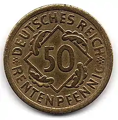 50 рентенпфеннігів | 24 | 5 | 140 зарубок | 91,5 % міді, 8,5 % алюмінію | 1923—1924 | 1923 (A) — 450861, 1923 (D) — 191865, 1923 (F) — 120000, 1923 (G) — 120000}}, 1923 (J) — 4000, 1924 (A) — 117364604, 1924 (D) — 30970627, 1924 (E) — 14668000, 1924 (F) — 21968181, 1924 (G) — 13348957, 1924 (J) — 17779252 |