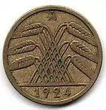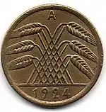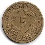 5 рентенпфеннігів | 18 | 2,5 | 84 зарубки | 91,5 % міді, 8,5 % алюмінію | 1923—1924 | 1923 (A) — 3083075, 1924 (A) — 171965942, 1923-1924 (D) — 31162741, 1923-1924 (E) — 12206000, 1923-1924 (F) — 29031725, 1923-1924 (G) — 19216809}}, 1923-1924 (J) — 32332435 |