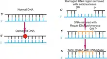 Під час ексцизійної репарації (від лат. excisio «вирізати») молекула ДНК сканується, знаходяться пошкоджені ділянки і видаляється нуклеотид або ціла частина одного ланцюгу ДНК навколо пошкодженого нуклеотиду. Вилучене місце «залатується» новосинтезованими нуклеотидами, які добудовуються комплементарно іншому, неушкодженому ланцюгу ДНК.