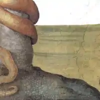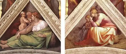 - Надалі Колалуччі говорить про «суворе дотримання» Мікеланджело техніки буон фреско; потім суперечить цьому, описуючи ретушування а секко, які Мікеланджело робив на плечі Елеазара і нозі Ровоама, обидва з яких — люнети. Потім він говорить, що Мікеланджело працював в буон фреско без власне пентіменто (пентіменто означає зміни), але тільки з малими корекціями на фресках[4].