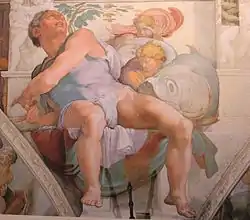 Велика фігура Йони має велике значення для всієї композиції, й образно й теологічно, являючи собою символ воскреслого Христа. Ця постать, що тягнучись назад, звертає погляд до Бога, обіймає вітрило, яке піднімається над вівтарною стіною для підтримки склепіння. Описаний Вазарі, ракурс фігури був новаторським і справив значний вплив на пізніших художників. Очищення цієї значної фігури залишило трохи чорної тіні, видної у лівому краї картини. Все інше, менш інтенсивне, чорні штрихи і розмивання, було видалене, що зменшило вплив радикального ракурсу, а також спустошило велику рибу, геніїв позаду Йони і архітектурні форми в деталях.