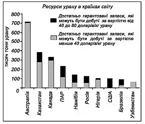 У групу країн із запасами понад 100 тис.т урану входили ПАР, Бразилія, Намібія, Росія, США й Узбекистан. У цих 9 країнах зосереджено 88 % світових загальних запасів урану.[1]