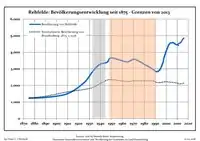 Динаміка населення з 1875 року в сучасних кордонах (Синя лінія: населення; Пунктир: відносна порівняльна динаміка населення землі Бранденбург; Сірий фон: період Третього рейху; Помаранчевий фон: період НДР)
