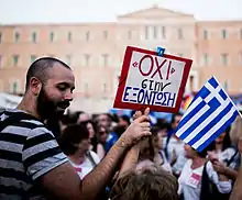 29 червня 2015 р. в понеділок ввечері близько 17 тисяч греків, в основному прибічників партії СІРІЗА, вийшли на демонстрації, щоб сказати «Ні» (грец. Όχι) пропозиціям міжнародних кредиторів. На акціях лунали заклики проголосувати проти вимог до Греції на референдумі[13].