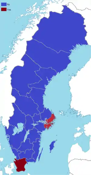 Явка виборців становила 82,6%, а результат склав 55,9% проти 42,0% на користь євро. [1] Більшість виборців у лені Стокгольм проголосували на користь прийняття євро (54,7% "так", 43,2% "ні"). У ленах Сконе і Стокгольмі голоси "так" (49,3%) перевищували кількість голосів "ні" (48,5%), хоча недійсними та порожніми голосами не стали більшістю для будь-якого з цих варіантів. У всіх інших частинах Швеції більшість проголосувала "ні".[2][3] Серед комун, більшість з західного Сконе та в Стокгольмі проголосували "так". Кунгсбака і Гапаранда також проголосували "так". Всі інші муніципалітети проголосували "ні".