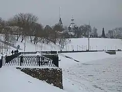 Набережна Дніпра, вдалині костел і собор