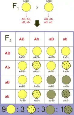 Аналогічно будується решітка Пеннета і в тих випадках, коли аналізується одночасно кілька незчеплених генів. Наприклад, якщо аналізується успадкування кольору і зморшкуватості насіння горошку (A — жовті сім'ядолі, a — зелені, B — гладке насіння, b — зморшкувате), у випадку схрещування двох дигетерозигот, решітка Пеннета виглядатиме так: