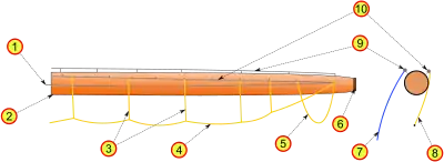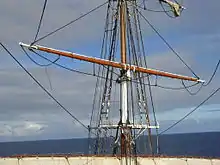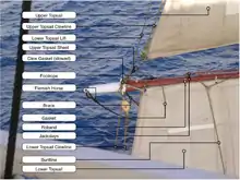- Бегін-рея, крюйсель-рея, крюйс-брам-рея, крюйс-бом-брам-рея, крюйс-трюм-рея, крюйс-мун-рея — на бізань-щоглі.