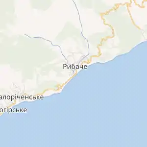Курорт Рибаче розташований на південному березі Криму, в долині гірських річок Андус і Алачук. Селище Рибаче знаходиться в нижній частині долини Андуз, з трьох боків оточують прекрасні гори: Сайнин-Бурну і Айман-Ташлар на заході; Букунбай на північному заході; Хумсал на півночі; Япул-Бурун і Янтуруз на північному сході. Від холодних північних вітрів селище захищає гірський масив Карабі-Яйла (висота більше 1 км). Через селище протікають річки Андуз-Су і Хун (на його східному краї), які на території селища зливаються в одну річку, майже біля самого гирла, перед впаданням у Чорне море. Відстань до Алушти — 30 км. Населення на 01.01.2009 р. — 1310 чоловік. За версіями назва села — «Тувак» (в перекладі — «щит», «заслін»).