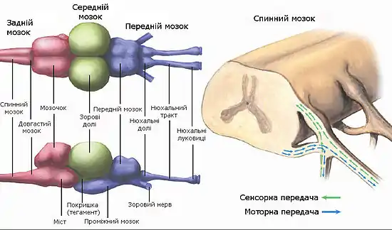 Середній мозок складається із зорових часток і тегментума, або покришки (tegmentum); обидві структури залучені до оброблювання оптичних сигналів.