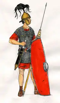 - Другий тип складався з 20 центурій. Озброювалися вони також, як і перший, але не мали панцира, а захищалися тільки поножами, шоломом і великим щитом — знаменитим згодом скутумом.