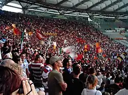 ![]() Гравці «Лаціо» та «Роми» разом чтуть хвилиною мовчання жертв землетрусу в Л'Акквілі перед матчем 11 квітня 2009 року. | |