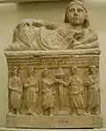 Саркофаги, що з'являються з VI століття до н. е., як правило, зображували покійного ще живим, він напівлежав на ложі в позі бенкетуючого, спершись на подушку і поглядав на глядача; на обличчі активна міміка, часто посмішка. Може зображати як одного покійного, так і парні подружні портрети (наприклад, Саркофаг Ларт Сейанті з Кьюзі; Саркофаг подружжя з некрополя Бандітачча (Черветрі), музей Вілли Джулія). Безсумнівно, на цю скульптуру мало великий вплив грецьке архаїчне мистецтво, але пози і жести етрусків вільніші і менш канонічні.