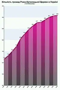 Ри́мсько-католи́цька це́рква в Украї́ні[4] (РКЦвУ) (лат. Ecclesia Catholica Romana in Ucraina), також Лати́нська це́рква в Україні (ЛЦвУ) — це католицька церква, яка використовує західні обряди в Україні. Латинська церква є головною частиною Католицької церкви, що очолюється Папою Римським і присутня на українських землях з X століття, від часів Київської Руси. За часів Речі Посполитої у XIV— XVIII століттях була одним із провідників західноєвропейської культури й науки в Україні. За часів Російської імперії та в більшовицько-радянської влади зазнала переслідувань, діяла в підпіллі. Після здобуття Україною незалежности в 1991 року перебуває у процесі відродження. Станом на 2021 рік нараховує 7 дієцезій, 1134 парафії, 3 вищі духовні семінарії, 12 єпископів[5] і близько 700 священників, частина з яких іноземці. Кількість вірних — близько 1,5 млн осіб. Від 2008 року її очолює львівський архиєпископ-митрополит Мечислав Мокшицький. Керується конференцією єпископів. Інформаційний офіс — Католицький медіа-центр. Найбільший паломницький центр — Бердичівський монастир. Головний навчальний заклад для світських осіб — Інститут Томи Аквінського в Києві.