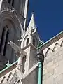 Вертикальна ринва (труба) містить такі елементи: лійку, коліна, міжколінні ланки і відвід. Лійка (жолобниця)[5] призначається для приймання води і може мати форму зрізаного конуса, піраміди чи паралелепіпеда. Коліна встановлюються, коли треба забезпечити вигин ринви (наприклад, для її проведення від крайки звису до стіни). Відвід розташовується внизу і слугує для спрямування вихідного потоку. Для приєднання додаткових труб ринва споряджається колекторами. Кріпиться труба до стіни хомутами на стрижнях.