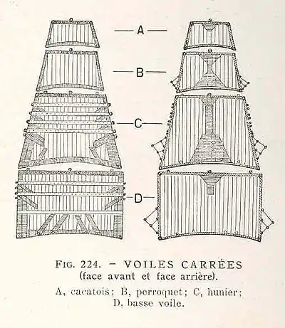 Риф (від нід. reef, rif або англ. reef)[3] — поперечний ряд протягнутих крізь вітрило зав'язок. На прямих вітрилах зав'язки називаються риф-сезні, на косих — риф-штерти. Риф-сезні схожі на звичайні сезні для прив'язування згорнутих вітрил: у вигляді плетінки з подвійним вічком, або короткі відрізки троса з вічком або кнопом на кінці[4]. Для кріплення зав'язок на вітрило нашивається горизонтальна смуга парусини — риф-бант; у ній зроблено отвори — риф-гати, через які і проходять зав'язки. Крім риф-сезнів, у риф-гати просилюється риф-леєр — довгий трос, що іде паралельно риф-банту. На кожному вітрилі буває по кілька рифів (у марселів чотири, у нижніх вітрил — два). Якщо на вітрилі взяті всі рифи (тобто на прямому вітрилі використаний найнижчий риф, на косому — найвищий), воно називається зарифленим «наглухо».