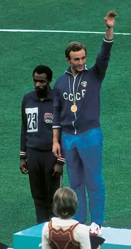 ![]() Роберт Тейлор та Валерій Борзов на церемонії нагородження призерів бігу на 100 метрів на Олімпіаді-1972 | |||||||||||