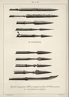 Рогати́на — різновид списа з довгим та широким вістрям; ніж, насаджений на довге древко[1]. Використовувалась як бойова (у середньовіччі) та мисливська (аж до XX ст.) зброя. Слово «рогатина» походить від слова «ріг», бо вістря первісних рогатин робилися з рога.