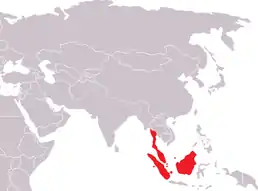 Вид поширений в Південно-Східній Азії. Трапляється на півдні М'янми і Таїланду, на Малайському півострові, Суматрі, Калімантані та деяких сусідніх островах (острови Ріау, Бангка, Белітунг, Натуна)