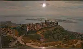 ![]() Дитинець давньоруського Родня на діорамі в Черкаському обласному краєзнавчому музеї. Автор А. В. Казанський, консультант Г. Г. Мезенцева. | |