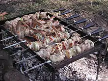 - Шампур (від груз. შამფური) — різновид рожна для приготування шашлику. Шампури бувають металевими (рідше дерев'яними), вони зазвичай мають форму вузької штаби 30-100 см завдовжки, загостреної з одного кінця і спорядженої ручкою з другого. Плаский переріз шампура перешкоджає провертанню шматочків м'яса.