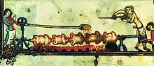 Жарення дичини на рожні з корбою. Мініатюра з повісті «Александрія», Брюгге, 1338-44 р.р. (Бодліанська бібліотека)