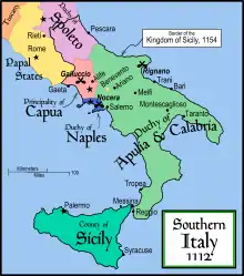 У 1127 році, по смерті Вільгельма II, Рожер II висадився в Італії, зайнявши Амальфі та Салерно, столицю Апулії. Втім Рожеру довелося надати значні земельні володіння місцевим баронам в обмін на свою підтримку. Після цього наприкінці того ж року Рожер II повернувся до Сицилії. Тут виявилося, що своїми спадкоємцями Вільгельм II також визнав Боемунда II, князя Антіохії, та папу римського Гонорія II. Останній бажав приєднати Апулію до володінь Папської області. Тому оголосив хрестовий похід проти Рожера. Його очолили Роберт II, князь Капуї, та Райнульф, граф Аліфе. Рожер II знову висадився в Італії у 1128 році, згодом при Брадано змусив своїх ворогів відступити. У серпні у м.Беневенто розпочалися перемовини поміж папою римським Гонорієм II та Рожером II. 22 числа було укладено угоду, згідно з якою папа визнавав Рожера герцогом Апулії, а той визнав себе васалом папського престолу. Також князівство Капуя визнавалося самостійним. Після цього, спираючись на свої права, Рожер II приборкав баронів, змусив визнати їх васалами володарів Капуї та Аліфе. У вересні у 1129 році у м.Мелфі зібрав збори знаті, де було встановлено «герцогський мир» (заборонялися війни між феодалами), а барони принесли васальну присягу Рожерові II.