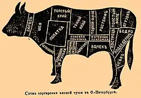 Схема сортування м'ясної туші ВРХ у С.-Петербурзі, Російської імперії, ілюстрація в ЕСБЄ.