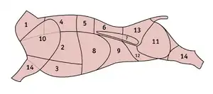 Республіки колишнього СРСР: 1 — шия; 2 — ребра; 3 — грудинка; 4 — товстий край; 5 — тонкий край, поперекова; 6 — оковалок; 7 — вирізка; 8 — пружок; 9 — очеревина, фланк; 10 — лопатка; 11 — стегно; 12 — пахвина; 13 — куприк; 14 — голінка.